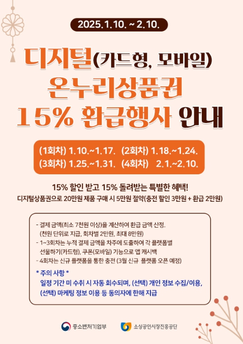 2025년 설날을 맞아 디지털 온누리상품권을 구매하면 최대 15%의 할인 혜택과 함께 15%를 환급받는 특별한 기회를 제공합니다. 디지털 상품권으로 20만원 제품을 구매할 경우, 5만원을 절약할 수 있습니다!