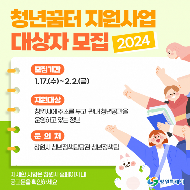 경남 창원특례시가  2월2일까지 2024년 창원형 청년꿈터 지원사업 대상을 모집합니다